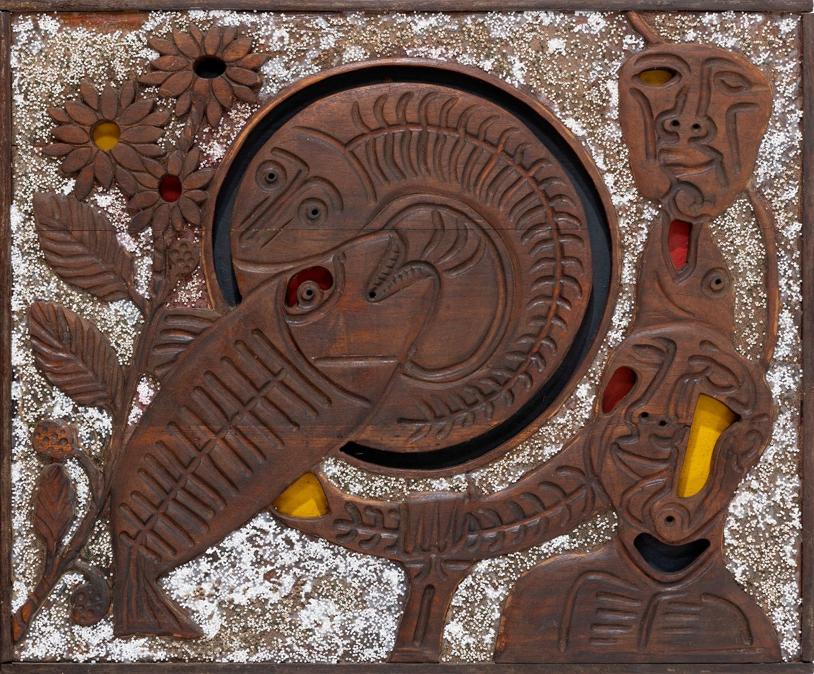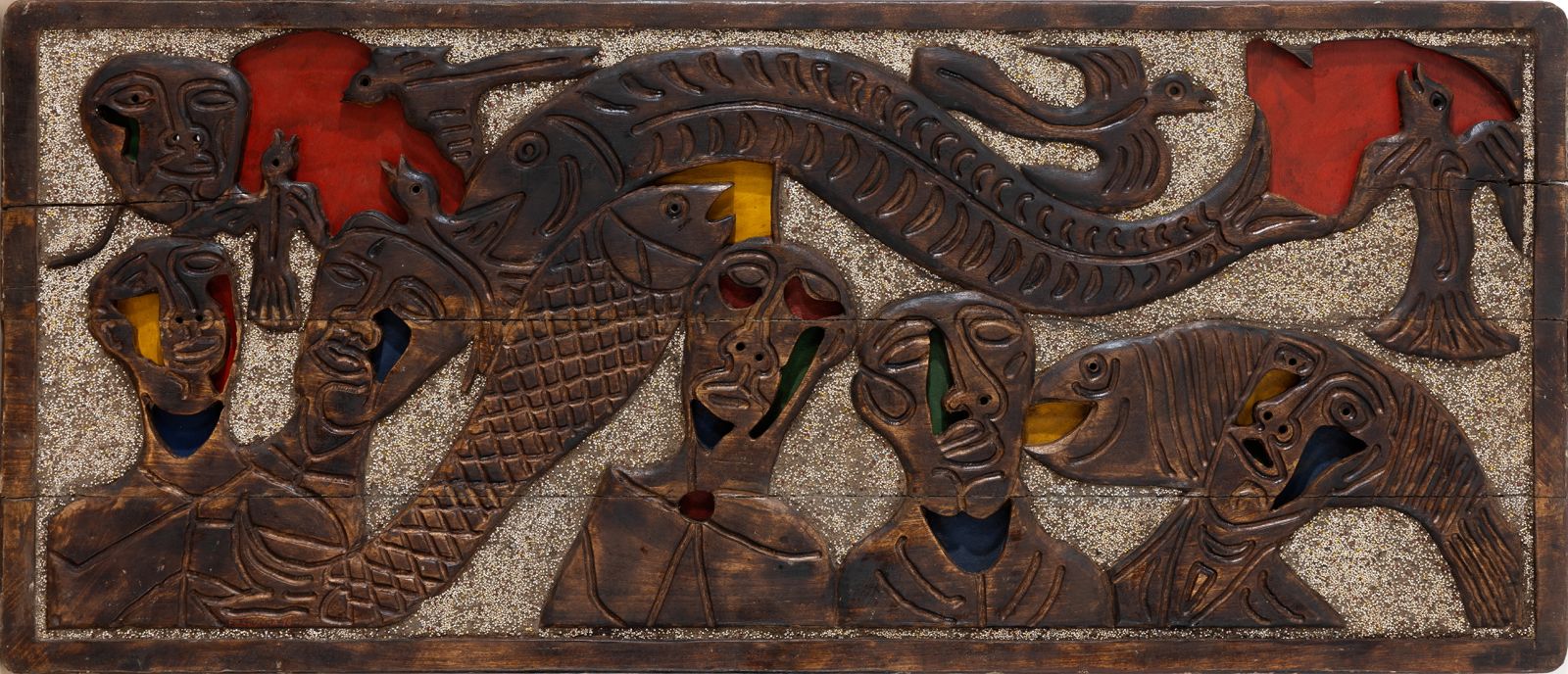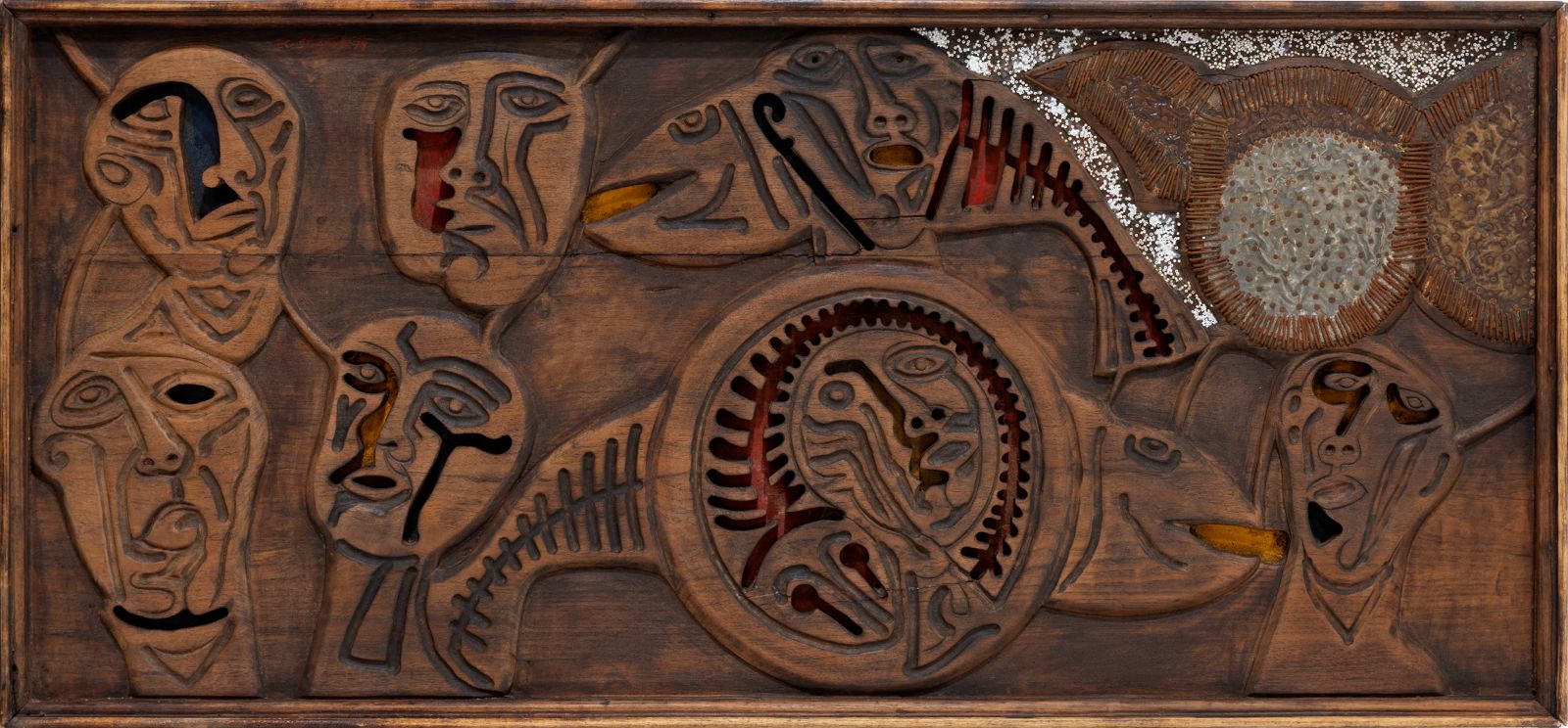 Working with materials such as wood, metal, nails, and pigment, Sagara created relief-like surfaces that blur the boundaries between painting and sculpture. His works often incorporate symbolic and architectural elements, emphasising texture, structure, and the passage of time.